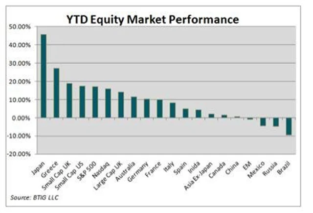 Řecké akcie s přehledem od začátku roku porážejí jak americký S&P 500, tak indexy menších, tedy volatilnějších titulů v USA i Británii. Na opačném konci žebříčku se krčí trhy zemí BRIC, ale například i ten kanadský.