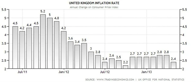Minulý týden Bank of England oznámila, že očekává, že by mohla 2% inflačního cíle dosáhnout dříve, než se předpokládalo. Banka předvídá, že inflace ve třetím čtvrtletí letošního roku vystoupá na 3,1 % (což je méně, než čekala předtím) a pod 2% inflační cíl by se ceny mohly dostat již ve třetím kvartále roku 2015. Zároveň zvýšila predikci růstu HDP v tomto čtvrtletí na +0,5 %.