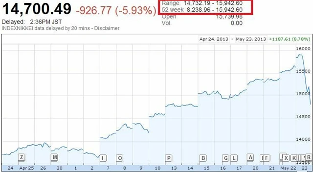 Možnost, že by QE v USA mohlo být postupně ukončováno, ale především propad čínské průmyslové aktivity posílají krátce před skončením obchodování japonský index Nikkei 225 o téměř 6 % níže. Téměř se dotkla 16 tisíc bodů, aby se propadl hluboko pod 15 tisíc.