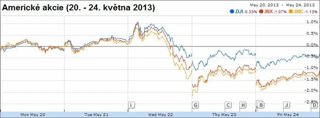 Americké akcie klesaly už od středy v reakci na slova šéfa Fedu Bena Bernankeho, který naznačil možnost omezení nákupů dluhopisů už na některém z příštích zasedání. Krajně uvolněná měnová politika, v níž Fed pumpuje na trhy velké objemy levných peněz, je jednou z hlavních příčin letošního silného vzestupu akciového trhu.