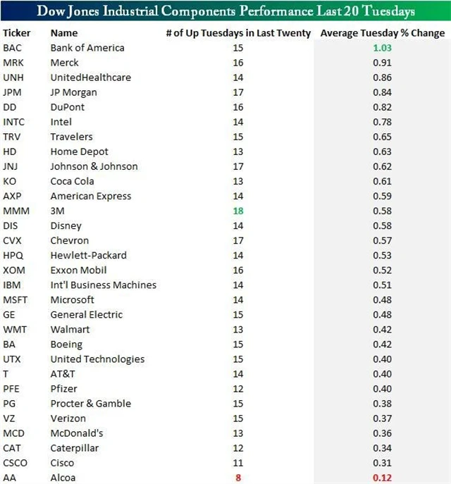 Analytici z Bespoke Investment Group si dali tu práci a ponořili se do dat z posledních dvaceti týdnů, respektive úterků. Nejvíce se daří v tyto dny akciím Bank of America, nejčastěji roste cena akcií 3M. Hliník se odstěhoval na chvost žebříčku.