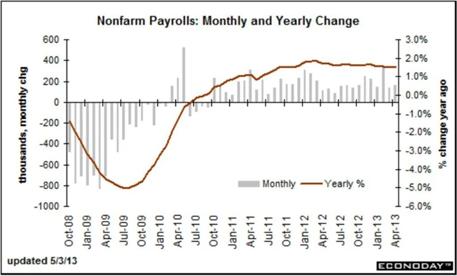 Americká ekonomika v dubnu vytvořila mnohem více pracovních míst, než se čekalo. Mimo zemědělství přibylo v minulém měsíci 165 tisíc míst (odhad: 140 tisíc), soukromý sektor vytvořil 176 tisíc míst (odhad: 150 tisíc). Průměrná hodinová mzda vzrostla o 0,2 % (oproti nulové změně v březnu). Míra nezaměstnanosti klesla na 7,510 % (v březnu 7,574 %). Březnové údaje byly výrazně pozitivně revidovány. Mimo zemědělství vzniklo 154 tisíc míst (revidováno z 88 tisíc v březnu) a v soukromém sektoru 154 tisíc míst (revidováno z 95 tisíc).