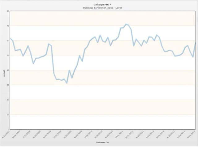 Index nákupních manažerů pro oblast Chicaga v květnu nečekaně vyskočil zpátky nad hranici padesáti bodů. Očekávalo se, že se po dubnovém propadu vyšplhá jen na padesát bodů, index však příjemně překvapil a odhady překonal o celých 8,7 bodu.
