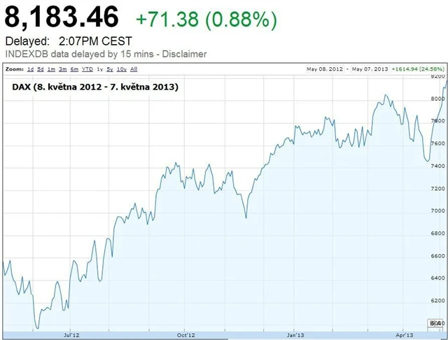 DAX zahrnuje akcie předních německých podniků. Během dneška stoupl na 8160,14 bodu. Překonal tak svůj dosavadní historický rekord 8151,57 bodu z poloviny roku 2007.