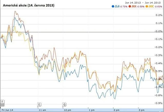 Dow odepsal 0,70 %, S&P 500 0,59 % a technologický Nasdaq 0,63 %. "Trh vrátil něco ze včerejších zisků, které podle mě spoustu lidí překvapily, protože čísla rozhodně nebyla tak býčí," prohlásil Joe Saluzzi z Themis Trading. "Jednou jsme nahoře, jednou dole," poznamenal, "a řekl bych, že trhy pořád táhnou nahoru myšlenky centrálních bankéřů a měny, jako je japonský jen."