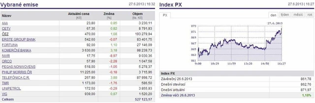 Index PX si připsal více než procento a zakončil o 1,18 % silnější na 871,97 bodu. Dařilo se akciím ČEZ, které zpevnily o 1,08 % na 470 Kč. V propadu pokračovala NWR, cena akcií firmy se propadla o 8,97 % na nová minima.
