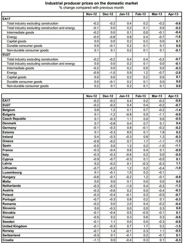 Bez zahrnutí energií průmyslové ceny meziměsíčně klesly o 0,2 % v eurozóně a 0,1 % v EU27. Ceny energií se proti březnu kvůli zlevnění ropných produktů a velkoobchodní elektřiny propadly o 1,6 % a vykázaly nejrychlejší pokles od července 2009. V meziročním srovnání se snížily o dvě procenta. Oproti dubnu minulého roku bez energií průmyslové ceny naopak vzrostly o 0,6 % v eurozóně a 0,7 % v EU27. Ceny energií se oproti loňskému dubnu snížily o 2,0 % v eurozóně a 2,8 % v evropské sedmadvacítce.