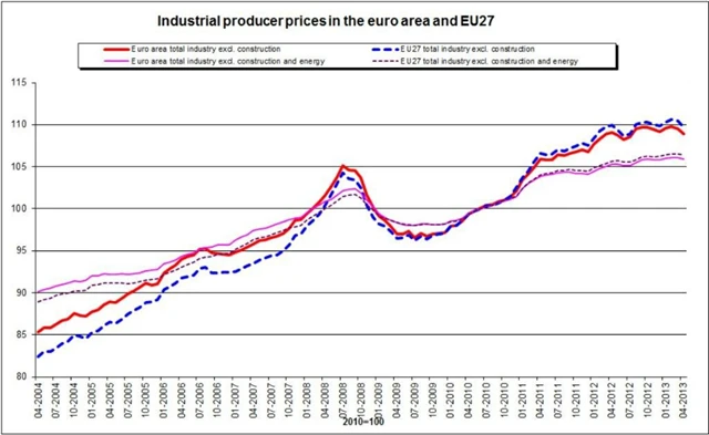 Index cen výrobců v eurozóně v dubnu klesl meziměsíčně o 0,6 %, v celé sedmadvacítce to bylo -0,7 %, nejvíce za téměř čtyři roky. V meziročním srovnání ceny klesly v eurozóna o 0,2 %, v EU27 o 0,2 %.