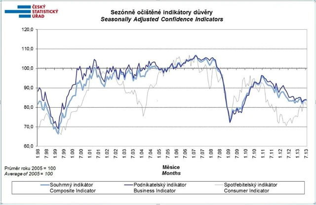 Celková důvěra v domácí ekonomiku v červenci mírně klesla. Souhrnný indikátor důvěry (indikátor ekonomického sentimentu) se ve srovnání s červnem snížil o 0,3 bodu. Indikátor důvěry podnikatelů se meziměsíčně nezměnil. V průmyslu a ve stavebnictví se důvěra zvýšila; v obchodě se zvýšila mírně; ve vybraných odvětvích služeb se snížila. Důvěra spotřebitelů meziměsíčně klesla. Ve srovnání s hodnotami v červenci 2012 jsou souhrnný indikátor důvěry a indikátor důvěry spotřebitelů vyšší; indikátor důvěry podnikatelů je nižší.