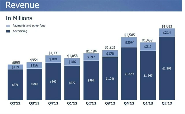 Facebook překonal hranici milionu aktivních inzerentů. Tržby společnosti ve druhém čtvrtletí 2013 dosáhly 1,81 miliardy dolarů, což je 53% nárůst oproti 1,18 miliardy dolarů v druhém kvartálu 2012. Z toho 1,599 miliardy pochází z reklamy a 214 milionů z plateb a dalších poplatků.