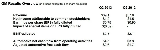 Čistý zisk GM klesl na 1,2 miliardy dolarů z 1,5 miliardy dolarů o rok dříve. Zisk na akcii bez započtení jednorázových výdajů dosáhl 84 centů a o devět centů překonal průměrný odhad analytiků dotázaných agenturou Thomson Reuters.
