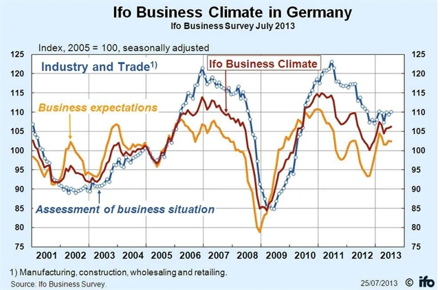 Podnikatelská nálada v Německu se v červenci třetí měsíc za sebou zlepšovala. Výsledky průzkumu, které dnes zveřejnil výzkumný institut Ifo, naznačují, že největší evropská ekonomika po slabém výkonu na začátku letošního roku nabírá na síle. Na německé ekonomice je závislá řada českých firem.