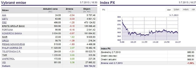 Akcie Erste spadly o 3,15 % na 500,9 koruny. Analytici z Barclays zvýšili doporučení pro Erste na "overweight", tedy že akcie přesahuje průměrný celkový výnos akcií, které analytikové sledují. Natixis pak snížila cílovou cenu titulu z 28 eur na 26,4 eura (zhruba 687 korun). "Další ranou byly zprávy z Maďarska. Dle zprávy Fitch tamní bankovní sektor čeká letos třetí rok ztrát a nová transakční daň sebere další čtvrtinu ze zisku před zdaněním," uvedl analytik z Patrie Finance Josef Kohout.