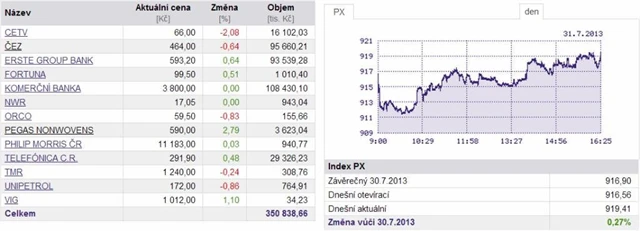 Ve spanilé jízdě pokračují akcie výrobce netkaných textilií Pegas Nonwovens, které ve středu přidaly 2,79 % na 590 Kč a za červenec přidaly 14 %. Stejně tak se relativně dařilo české Telefónice, která zdražila o 0,48 % na 291,9 Kč. V plusu skončily také Erste (+0,64 %) a Fortuna (+0,51 %). Nedařilo se naopak akciím ČEZ (-0,64 %).