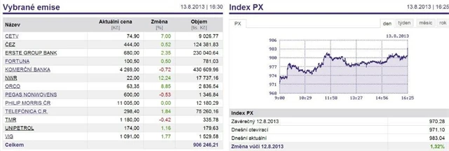 Index PX v úterý připsal 1,32 % na 983,04 bodu. Nahoru ho vytáhly především akcie NWR, developera Orco a mediální CETV.