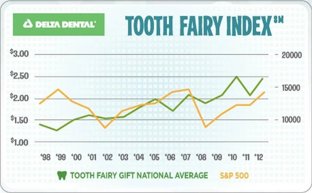 Podle průzkumu společnosti Delta Dental zveřejněného v únoru letošního roku vzrostla hodnota dětského zubu meziročně o 15 % na 2,42 USD v roce 2012 oproti z 2,10 USD rok dříve. Index zoubkové víly (Tooth Fairy Index) podle průzkumu koreloval s indexem S&P 500 devět z posledních deseti let. Během recese klesal a v loňském roce dosáhl maxima za poslední dekádu. Nárůst o 15 % podle společnosti Delta Dental koreluje s 13,4% ziskem indexu S&P 500.