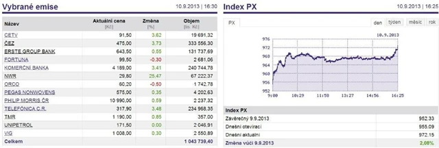 S cennými papíry ČEZ, Komerční banky a Telefóniky se obchodovalo v největších objemech ze všech 13 hlavních emisí. Akcie ČEZ zvýšily cenu o 3,73 % na 475 korun, akcie Telefóniky o 3,48 % na 317,9 koruny a akcie Komerční banky o 3,41 % na 4 189 korun. V plusu uzavírala obchodování i bankovní skupina Erste, jejíž cenné papíry posílily o 0,55 % na 643,5 koruny.