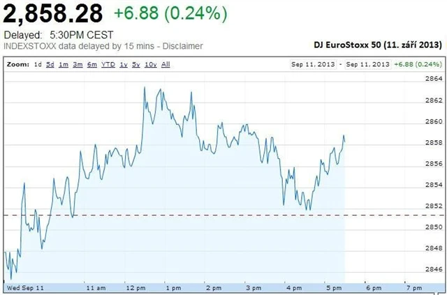 Index nejvýznamnějších společností zemí eurozóny DJ EuroStoxx 50 posílil o 0,4 % na 2 863,44 bodu a dosáhl nejvyšší úrovně od počátku července 2011. Široký západoevropský index FTSEurofirst 300 stoupl o 0,3 % na 1 247,61 bodu a je těsně pod květnovým pětiletým maximem 1 258,09 bodu.