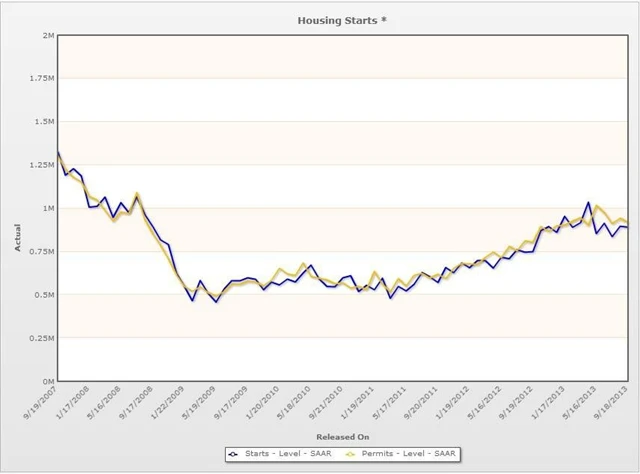 Stavitelé v srpnu zahájili práci na méně domech, než se původně očekávalo. Zahájená výstavba vzrostla jen o 0,9 % na celoroční tempo 891 tisíc, analytici vyhlíželi 917 tisíc. Červencové údaje byly navíc revidovány níže na 883 tisíc z původně hlášených 896 tisíc. Rostoucí hypoteční sazby tak očividně zpomalují oživení na trhu s nemovitostmi. Počet vydaných stavebních povolení klesl o 3,8 % na celoroční tempo 918 tisíc.