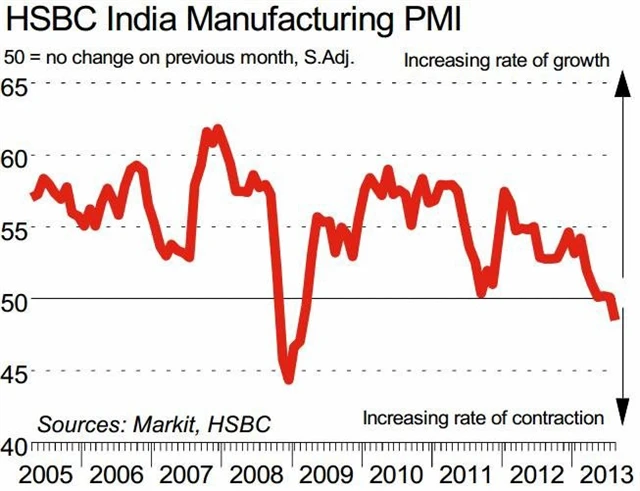 Aktivita v indickém průmyslu se v srpnu po více než čtyřech letech snížila. Index nákupních manažerů ve zpracovatelském sektoru klesl z 50,1 bodu v červenci na 48,5 bodu. Klesala výroba, nové zakázky, po 11 měsících dokonce i export.
