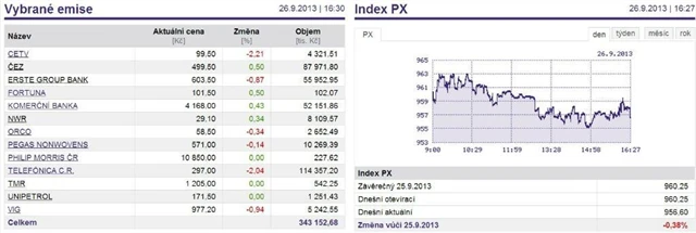 Pražský akciový trh oslabil na rozdíl od hlavních burz, podotkl Josef Němý z investičního bankovnictví Komerční banky. Index PX ve čtvrtek odepsal 0,38 % na 956,60 bodu.