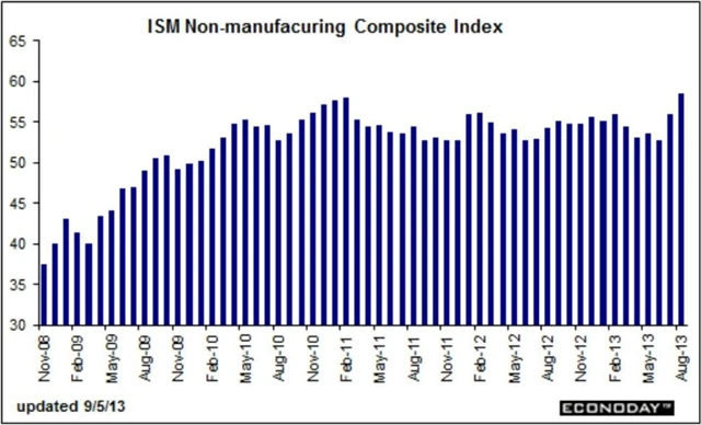Index nových zakázek se zvýšil o 2,8 bodu na 60,5 bodu a ocitl se nejvýše od února 2011. Index zaměstnanosti pak stoupl nejvýše za šest měsíců, a to na 57 bodů z červencových 53,2 bodu. To je velmi povzbudivá zpráva pro trh práce, protože sektor služeb se na celkové zaměstnanosti v USA podílí zhruba 90 %. Právě zlepšení na trhu práce je hlavní podmínka zahájení ústupu od QE. Silný růst ISM zaznamenal tento týden i v průmyslovém sektoru.