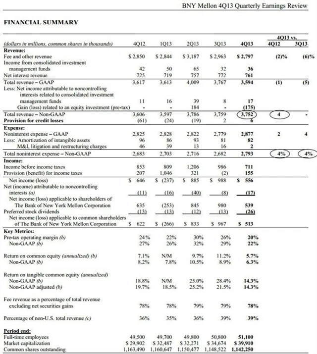 Americká Bank of New York Mellon ve čtvrtém kvartále dosáhla zisku 513 milionů dolarů, neboli 44 centů na akcii - po očištění o ztrátu spojenou s investováním do akcií byl zisk 628 milionů, tedy 54 centů na akcii. Celkové tržby (3,59 miliardy dolarů) představují oproti poslednímu kvartálu roku 2012 pokles o jedno procento. Čistá úroková marže se oproti třetímu čtvrtletí 2013 snížila na 1,09 % z 1,16 %, meziročně však zůstala beze změny.