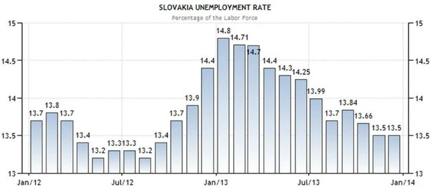 Slovensko se v EU řadí ke státům, které mají vyšší nezaměstnanost, než je unijní průměr. V České republice je míra nezaměstnanosti dlouhodobě nižší než na Slovensku - v prosinci činila 8,2 %, ve srovnání s listopadem stoupla o půl procentního bodu.
