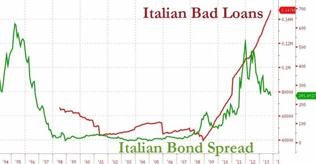 Výnosy italských dluhopisů klesají a pohybují se kolem sedmiletých minim, nesplácené půjčky jsou však na rekordních hladinách. Meziroční nárůst o 23 % v listopadu na 149,6 miliardy eur představuje nejrychlejší tempo za poslední dva roky, a zároveň růst na 7,8 % z celkových úvěrů z 6,1 % v listopadu 2012.