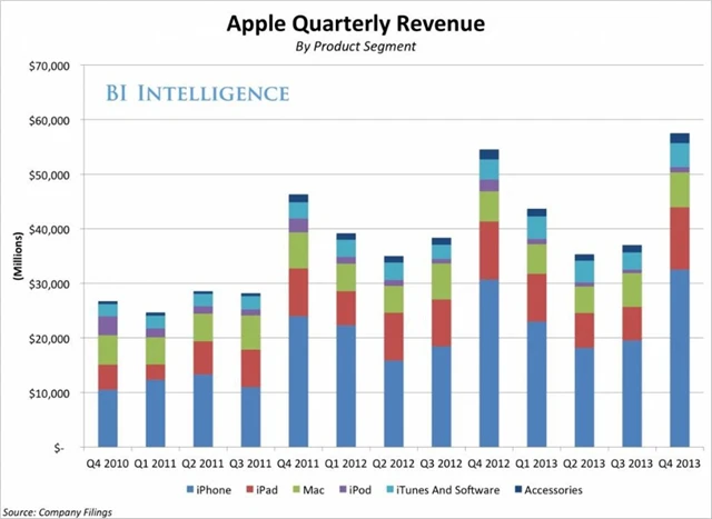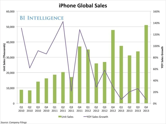 Výsledky za poslední kvartál 2013 ukazují, že růst poptávky po iPhonech, které jsou hlavním zdrojem příjmů Applu, zpomaluje. Konkurence nezahálí a uvádí na trh nové modely. Čísla o prodejích v posledním čtvrtletí jsou přitom vždy velmi očekávaná, protože vánoční tržby ukazují, jak velký je o produkty firmy zájem. Ani rekordní prodeje iPhonů tak nejsou považovány za dobrou zprávu.