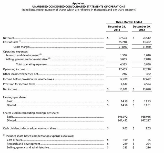 Od Applu se čekalo meziročně mírné zlepšení čísel, zisk na akcii měl podle odhadů agentury Bloomberg ve 4Q2013 být 14,07 USD. Od tržeb se čekal 5% růst na 57,5 miliardy USD. Dobrou zprávou tak je, že Apple svými čísly i přes nečekaně slabý prodej iPhonů dokázal překonat odhady.