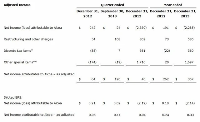 Po závěru obchodování zveřejnil čtvrtletní finanční výsledky hliníkárenský gigant Alcoa (v řádném obchodování -1,29 %), který bývá tradičně považován za indikátor stavu globální ekonomiky. Firma vykázala čistou čtvrtletní ztrátu 2,3 miliardy USD (2,19 USD na akcii, loni zisk 0,21 USD na akcii) při tržbách 5,59 miliardy USD (odhad 5,36 miliardy USD, loni 5,9 miliardy USD). Při upravených výsledcích firma dosáhla zisku na akcii 0,04 USD (odhad: zisk 0,06 USD). Akcie Alcoy v reakci na slabší výsledky v after-marketu oslabovaly o 4 %. Za celý loňský rok firma vykázala čistou ztrátu 2,3 miliardy USD (2,14 USD na akcii, loni čistý zisk 191 milionů USD, tedy 0,18 USD na akcii). Po očištění výsledků o jednorázové položky společnost v loňském roce dosáhla zisku 357 milionů USD ve srovnání se ziskem 262 milionů v roce 2012. Tržby v roce 2013 dosáhly 23 miliard USD (loni 23,7 miliardy USD, meziročně -4 %).