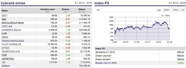 Index PX ve čtvrtek zpevnil o 0,26 %. Odpoledne se obchodoval nad hranicí 1 000 bodů, ale neudržel ji a zakončil na 998,94 bodu.