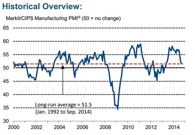 Expanze zpracovatelského sektoru ve Spojeném království se v září výrazně zpomalila. Firmy reportují pomalejší růst produkce, slabší příliv nových firem do odvětví i méně exportních zakázek. Index nákupních manažerů spadl na 17měsíční minimum 51,6 bodu a zůstal tak jen těsně nad dlouhodobým průměrem 51,5 bodu.
