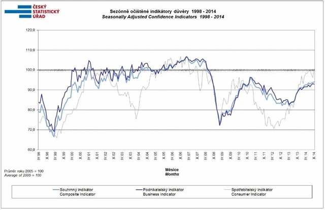 Důvěra v českou ekonomiku v říjnu stoupla na 8,8 bodu, meziměsíčně se tak potřetí za sebou zvýšila o 0,4 bodu. V porovnání se zářím však hodnotí celkovou ekonomickou situaci pozitivněji jen spotřebitelé, důvěra firem klesla. Mezi podnikateli se důvěra zvýšila jen v obchodě, naopak se snížila v průmyslu, službách a stavebnictví. Informoval o tom v pátek Český statistický úřad.
