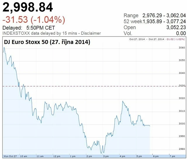 Obchodování na hlavních evropských akciových trzích v úvodu nového týdne skončilo v červených číslech. Investory nepříjemně překvapilo zejména zhoršení podnikatelské nálady v Německu, která se dostala dokonce na nejnižší úroveň za téměř dva roky. Ostře sledované byly v pondělí především akcie evropských bankovních domů, které podstoupily zátěžové testy Evropské centrální banky.
