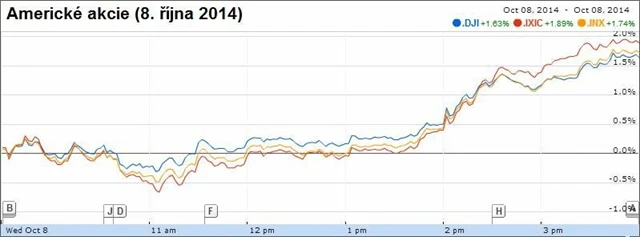 Dow ve středu nakonec posílil o 1,64 % na 16 993,96 bodu, S&P 500 přidal 1,75 % na 1 968,89 bodu a Nasdaq zpevnil o 1,90 % na 4 468,59 bodu. Rostly ceny akcií ve všech hlavních odvětvích, nejvíce v sektorech technologií, zdravotní péče a základních materiálů, o necelé procento zpevnily energetické tituly. Index volatility VIX spadl o 12,44 % na 15,06 bodu. Dále ovšem posilovaly dluhopisy, výnosy 10letých vládních bondů spadly o 3 bazické body na 2,31 %.