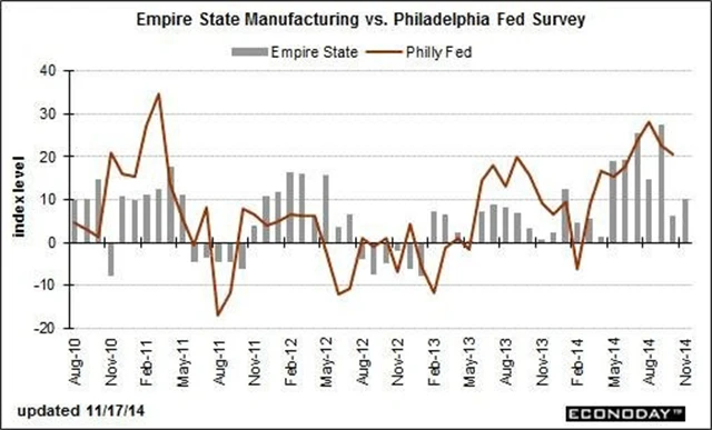 Průmyslová aktivita ve státu New York v listopadu vzrostla z říjnových zhruba půlročních minim. Index podmínek v byznysu označovaný jako Empire State narostl na 10,16 bodu z říjnových 6,17 bodu. Ekonomové v anketě Reuters očekávali růst na 11 bodů, podle Bloombergu 10,5 bodu.