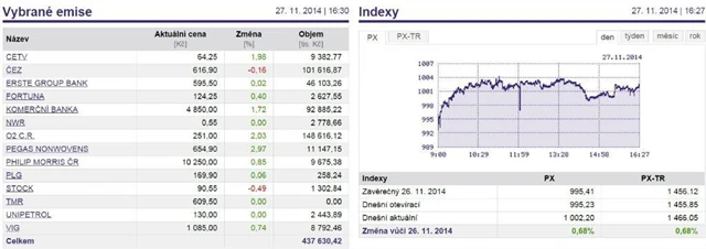 Pražská burza ve čtvrtek posílila, index PX překonal hranici tisíc bodů