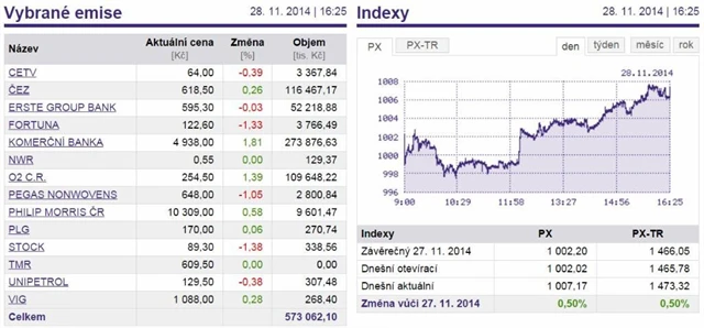 Nejvíce zdražily akcie Komerční banky, jejichž cena vzrostla o 1,81 % na 4 938 korun. Akcie KB na pražské burze taktéž zajistily s přehledem největší objem obchodů. Přes procento zdražily ještě akcie telekomunikační společnosti O2 Czech Republic (+1,39 %), které byly po akciích Komerční banky a energetické společnosti ČEZ (+0,26 %) třetím nejobchodovanějším titulem.