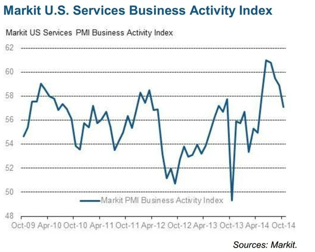 Expanze amerického sektoru služeb v říjnu mírně zpomalila. Index nákupních manažerů klesl na 57,1 bodu ze zářijových 58,9 bodu. Předběžná data počítala s poklesem na 57,3 bodu. Kompozitní index spadl na 57,2 bodu z 59 bodů v září, podle předběžných dat se měl snížit na 57,4 bodu.