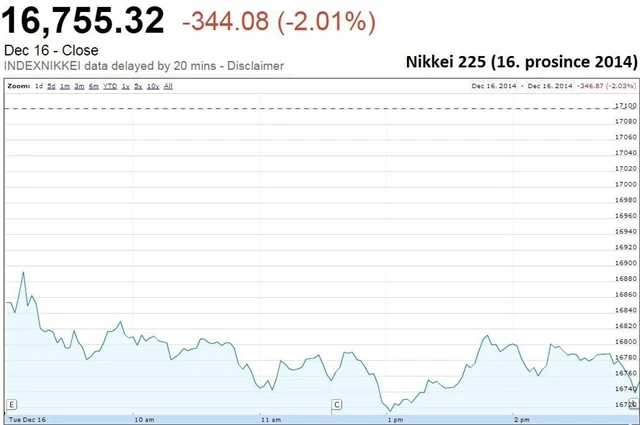 Japonský Nikkei odepsal přes dvě procenta a spadl pod hranici 17 tisíc bodů na pětitýdenní minimum. Index nákupních manažerů ve zpracovatelském sektoru v prosinci podle předběžných dat vzrostl na 52,1 bodu (listopad: 52 bodů), trh však tlačil dolů silnější jen, který se negativně odrážel na akciích exportérů.