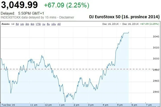 Britský FTSE 100 připsal 2,41 %, francouzský CAC 40 2,19 % a německý DAX 2,46 %. Regionální Stoxx Europe 600 posílil o 1,7 %, nejlépe si vedl energetický sektor, který zpevňoval poprvé po sedmi dnech - Royal Dutch Shell i BG Group připsaly obě kolem 4 %.