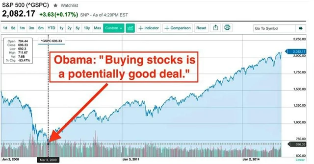Šest dní po tomto Obamově komentáři S&P 500 dosáhl dna 666 bodů. Toto úterý index S&P 500 uzavřel na rekordních 2 082 bodech, což je solidní růst o 200 % za méně než 6 let. Obamově odhadu nelze než zatleskat.