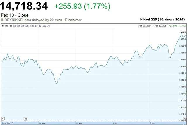 Regionální MSCI Asia Pacific zpevnil čtvrtý den v řadě, japonský Nikkei připsal 1,77 %. Po týdnu prázdnin znovu obchodovala i pevninská Čína, Shanghai Composite posílil o 2,03 %, zatímco hongkongský Hang Seng ztratil 0,27 %. Japonský širší index Topix zpevnil o 1,3 % díky oslabujícímu jenu, australský S&P/ASX 200 vzrostl o 1,0,8 % a jihokorejský Kospi zakončil na nule s mírným ziskem 0,04 %.