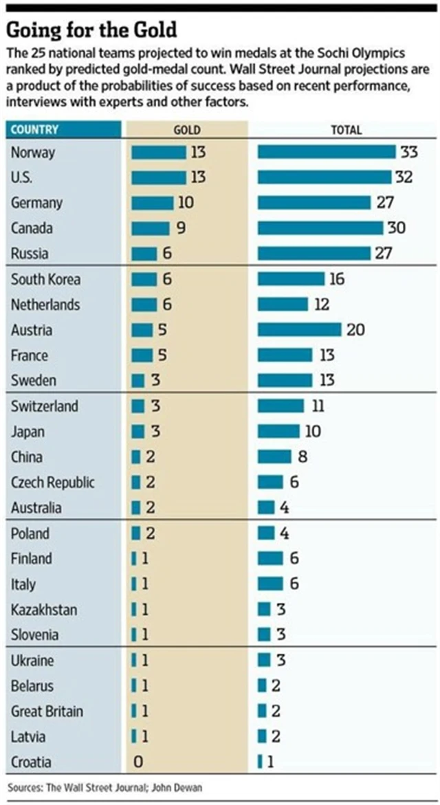 Výhled umístění reprezentantů jednotlivých zemí na stupních vítězů na olympijských hrách v Soči v přehledné tabulce. Zlato naturalizované Slovenky Kuzminové v biatlonovém sprintu v jednom z prvních závodů her ale na výsledkovou listinu zařadilo minimálně jednu zemi, která v medailovém výhledu z dílny WSJ není.