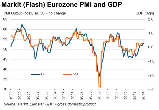 Souhrnný index nákupních manažerů, který zahrnuje data za zpracovatelský průmysl i sektor služeb, podle prvních údajů tento měsíc klesl na 52,7 bodu z 52,9 bodu v lednu. Index měří podnikatelskou aktivitu v tisících firem a je vnímán jako solidní ukazatel zdraví ekonomiky. Klíčová je pro něj hranice 50 bodů, která odděluje růst od poklesu. V lednu byl konečný index nejvýše od června 2011. Analytici v průzkumu Reuters čekali, že tento měsíc stoupne na 53,1 bodu.