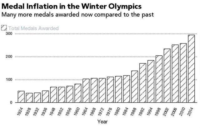 Z prvního grafu je zřejmé, že v posledních třiceti letech došlo k masivnímu nárůstu celkového počtu medailí. Na letošních ZOH je možné získat 294 medailí v 98 kláních. Od roku 1988 se tak jejich počet více než zdvojnásobil, na příštích ZOH je tedy pravděpodobné, že se bude rozdávat již 300 medailí a nedlouho poté 400.