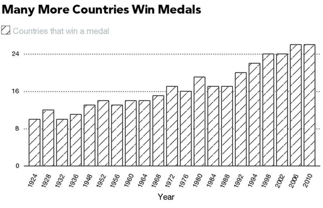 Více disciplín a soutěží znamená více vysílacího času v televizi, a tudíž vyšší příjmy z reklamy, média tedy takový nárůst rozhodně vítají. A více klání znamená také více soutěžících zemí. V roce 1924 si mezi sebe rozdělilo ocenění 10 zemí, v roce 1992 už počet vítězů překročil dvacítku a na posledních dvou olympijských hrách se medaile dělily mezi 26 zemí.