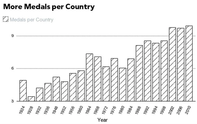 Ač roste počet medailových zemí, obrovský počet disciplín zajišťuje nárůst průměrného počtu medailí na zemi. Dříve si jedna země odnášela z olympijských her méně než pět medailí, dnes je to kolem deseti.